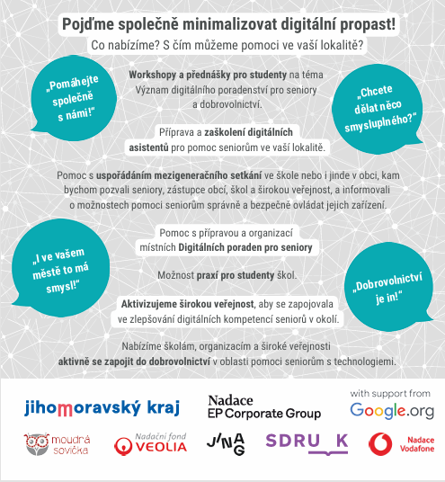 Celý projekt vychází z mnohaleté práce spolku Moudrá Sovička, z.s., který se už od roku 2015 věnuje vzdělávání seniorů pomocí školení, kurzů a konzultací. Projekt mohl být významně posunut v oblasti IT díky dobrovolném zapojení expertů z komunity Česko.Digital, ale také samotných seniorů a studentů středních škol.